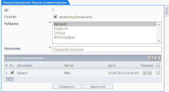 Для редактирования комментариев, достоточно зайти через один из основных модулей (за которым закреплены комментарии) выбрав нужный элемент, либо через модуль комментариев на прямую выбрав нужный раздел и элемент.