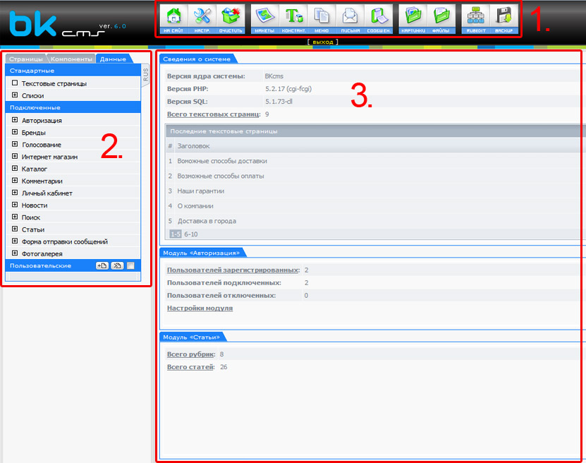 Интерфейс системы управления сайтом состоит из трех основных блоков: