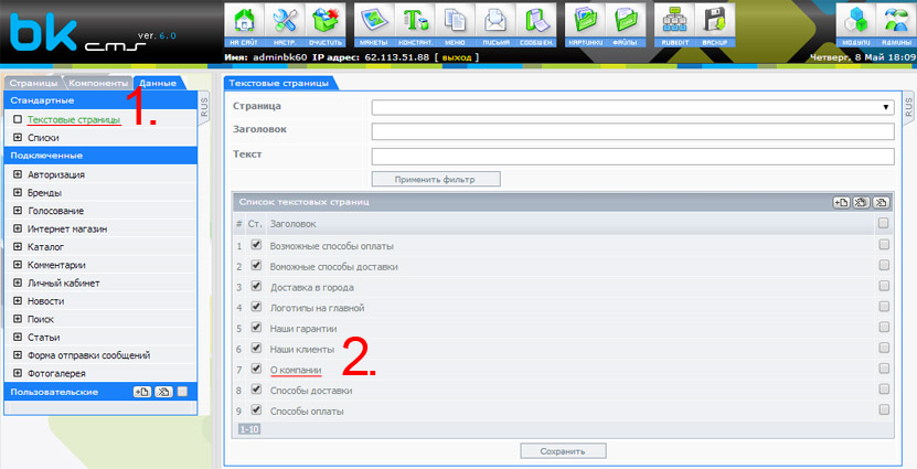 Для редактирования текстовых страниц сайта, выбираете в левом навигацинном меню пункт "Текстовые страницы". В центральной части админки откроется таблица с перечнем существующих текстовых страниц на вашем сайте. Для редактирования, нажимаете на название страницы.