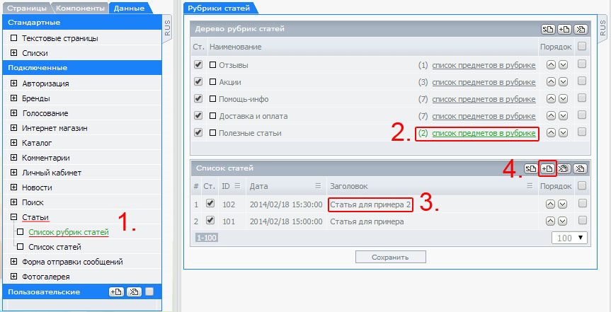 1. В левом навигационном меню выбирается пункт "Статьи" - > "Список рубрик статей"