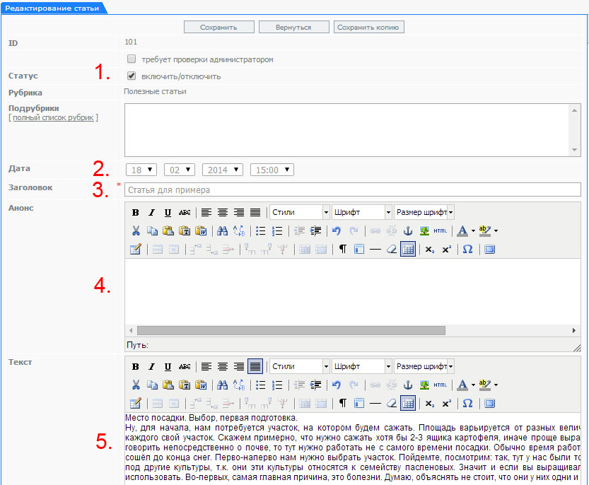 Для добавления статьи на сайт или редактирования существующей статьи:
