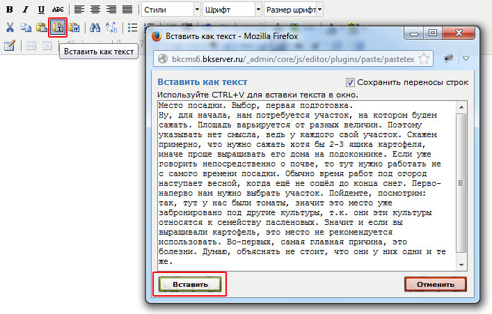 2. Вставить текст на сайт с помощью визуального редактора через кнопку "вставить как текст"