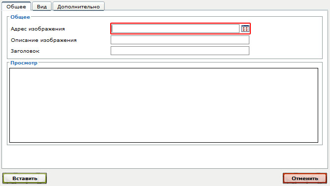 В открывшемся окне для вставки картинки, у поля "Адрес изображения" выбирается кнопка "обзор":