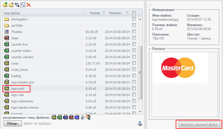 После этого откроется библиотека изображений вашего сайта. Выбрав нужную картинку, нажимаете "Выбрать данный файл" (о том как загружать новые картинки на сайт читайте в разделе