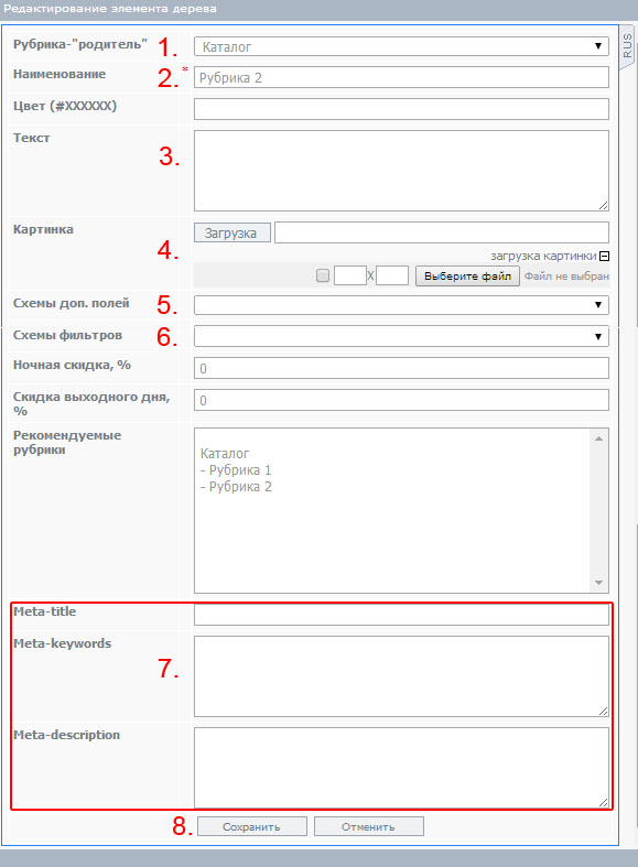 1. Рубрика родитель (корневой раздел для создаваемой рубрики).