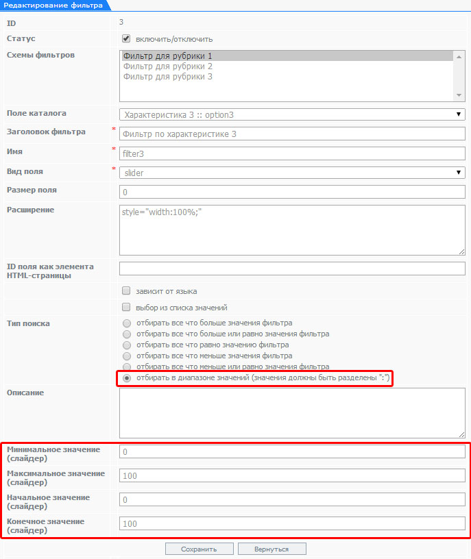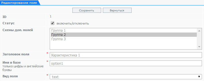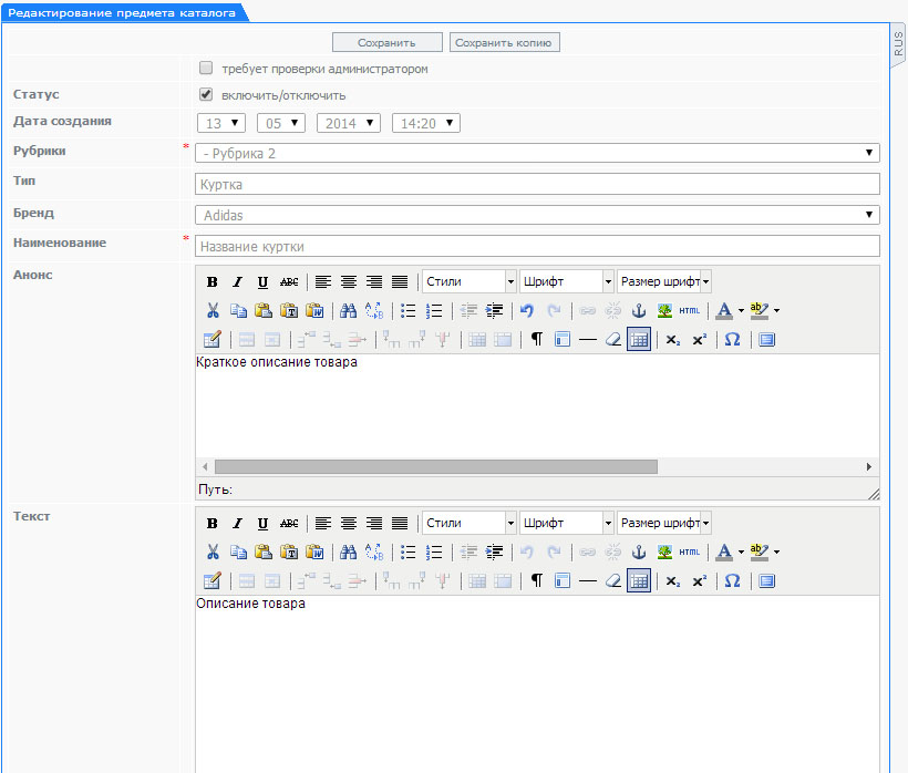 Редактирование/добавление раздела каталога представляет собой перечень полей для заполнения: