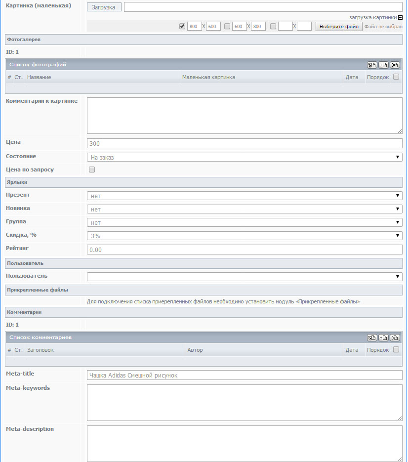После сохранения товара, можно продолжить работу с остальными полями: