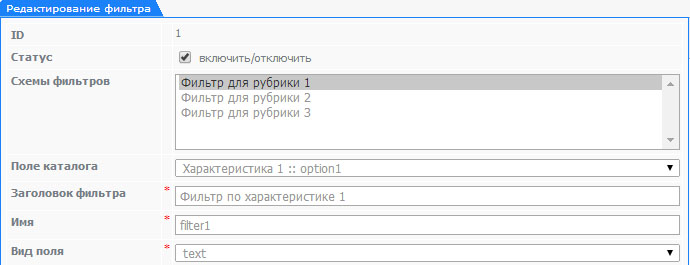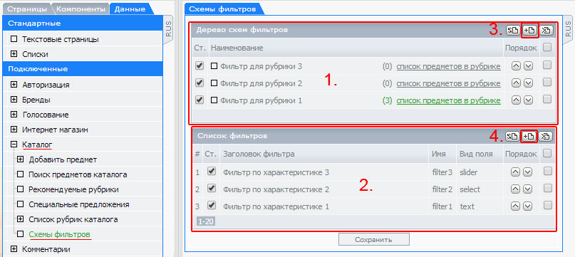 Для создания фильтра, нужно перейти в раздел "Каталог" - "Схемы фильтров"
