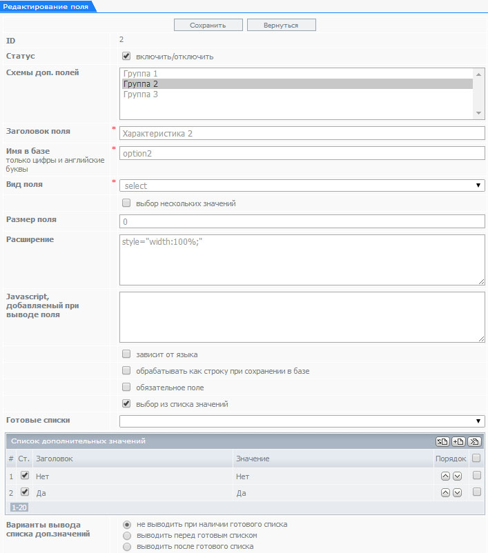 Отличие состоит в том, что в полях с выбором значений, открывается таблица "Список дополнительных значений" куда можно вписать возможные для выбора варианты.