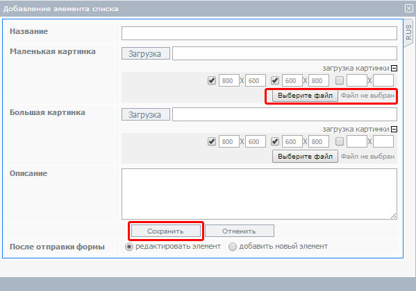 Нажав "добавить элемент в список" откроется окошко для добавления фотографии: